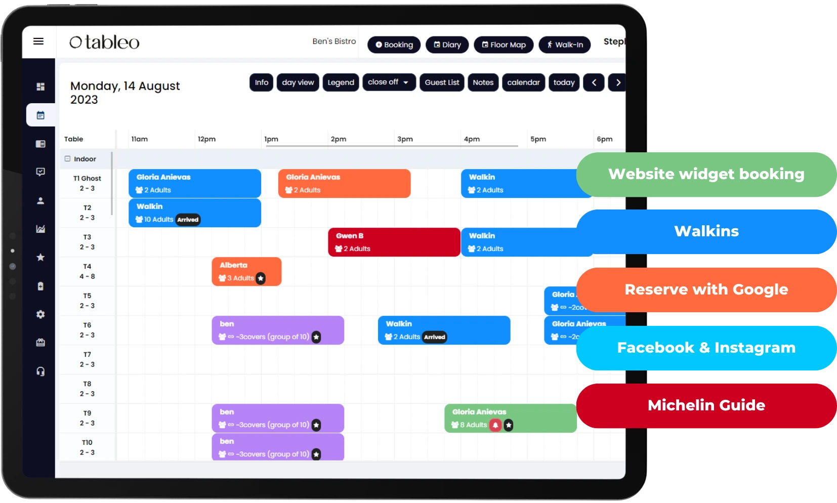 Har du styr på reservationer fra telefon, sociale medier og spontant besøg? Glem papirdagbogen. Med Tableo har du alle bookinger samlet ét sted, farvekodet for nem oversigt. Du kan hurtigt se, hvem der kommer, hvem der er forsinket, og hvem der ikke møder op.
