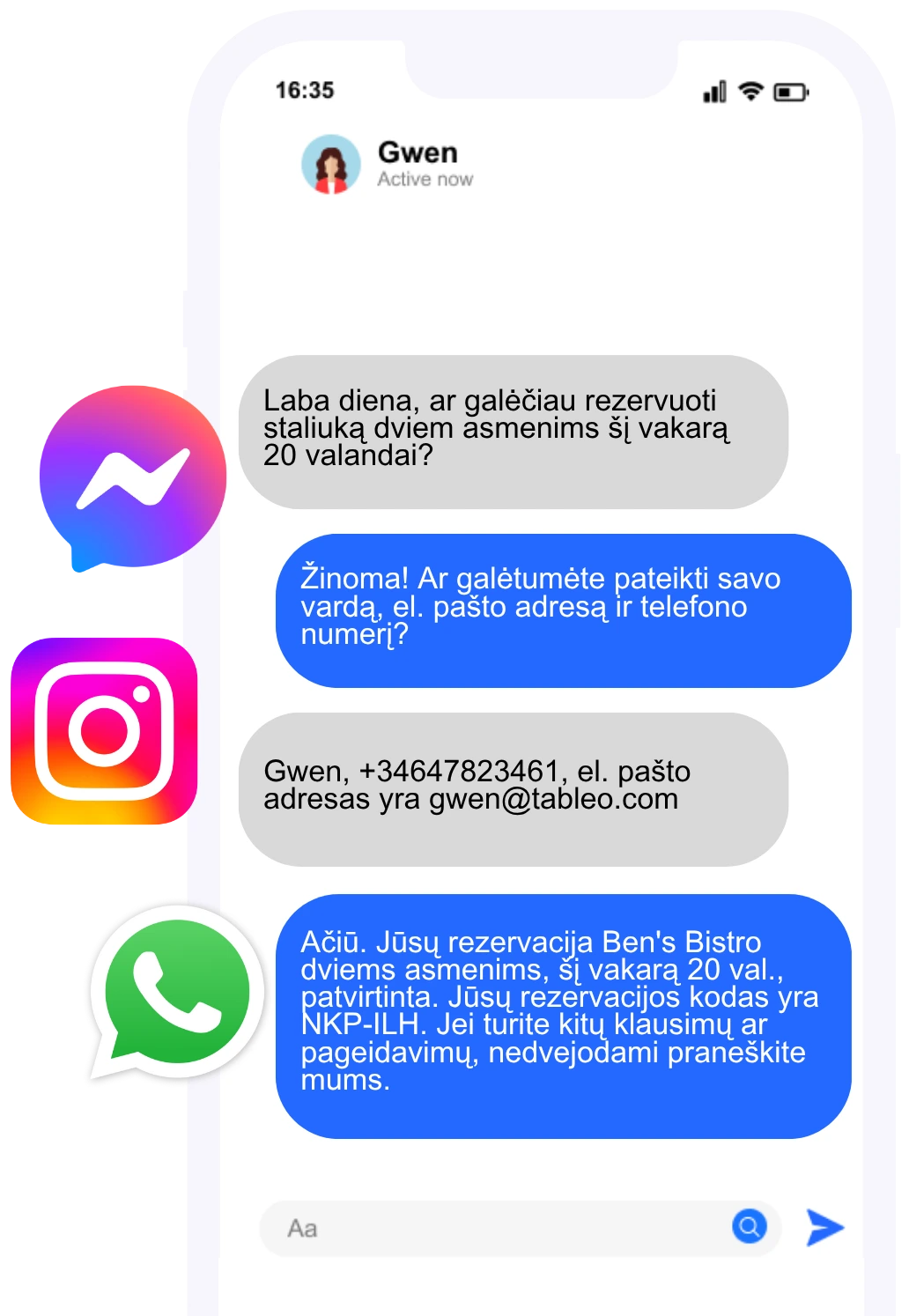 Ar pavargote kasdien gauti tuos pačius pranešimus, kuriuose teiraujamasi apie darbo laiką ar meniu? Ar žmonės tikisi, kad atsakysite 20 val. vakaro, norėdami rezervuoti staliuką, kai aptarnavimas yra pačiame įkarštyje, o virtuvė dega? Prarandate klientus, nes negalite atsakyti pakankamai greitai? Jei į bet kurį iš šių klausimų atsakėte teigiamai, „Tableo“ turi sprendimą!